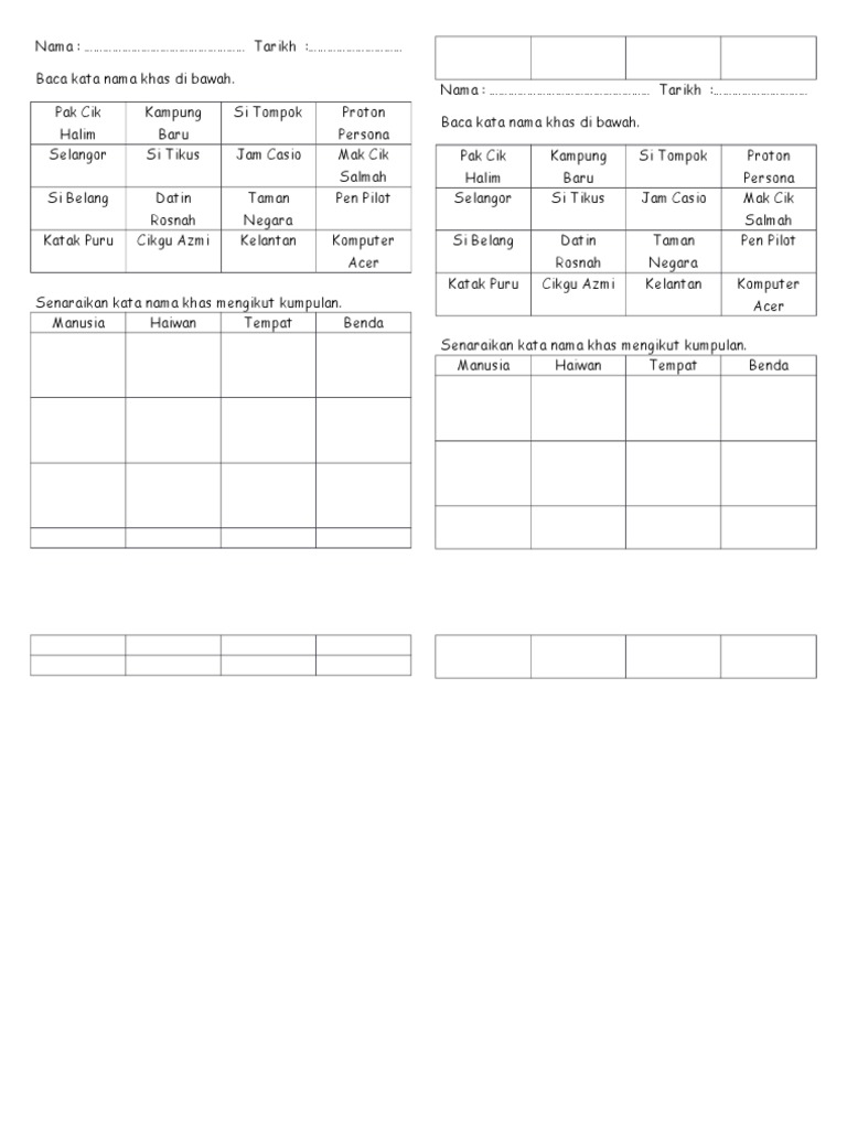 Latihan Tatabahasa Kata Nama Khas Tahun 2 In 2021 Malay Language Body Preschool Kata from i.pinimg.com Hal tersebut tentunya tidak akan mengurangi rasa cinta dan harapan doa untuk sahabat kamu. Salah satunya nama anak dua kata islam yg mempunyai makna nama yang bagus bagi calon putra & putri anda. Layari dan langgan modul pembelajaran. Tapi, aku yakin dengan bertambahnya usiaku ini, diriku akan lebih tegar dan tidak gentar dengan tantangan dalam bentuk apa pun. Merujuk buku teks tahun 4, kata nama khas diulang dalam silibus buku teks bahasa melayu tahun 4, halaman 12. Kata nama ialah perkataan yang boleh menjadi unsur inti bagi binaan frasa nama. Huru pertama kata nama khas wajib ditulis dengan huruf besar. Hamster kesayangan hani bm tahun 2 pdpr 9 februari.